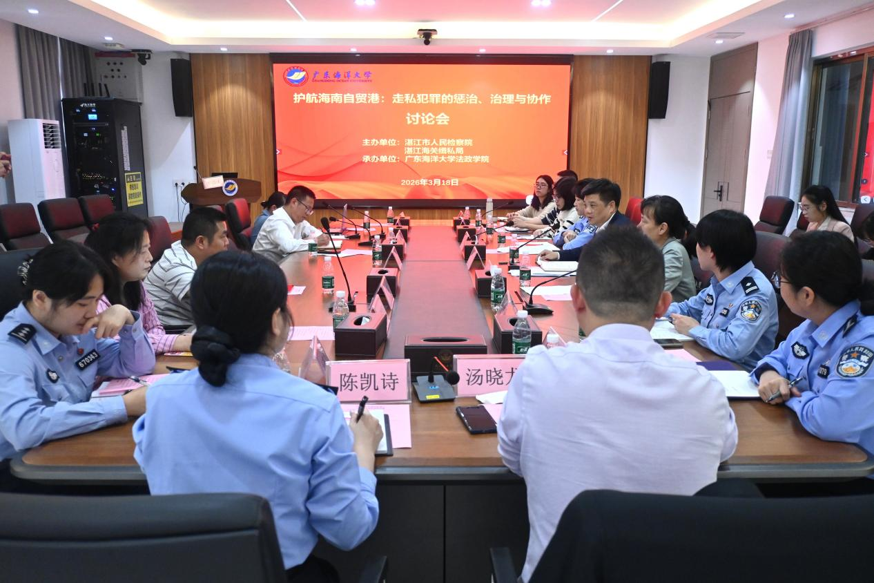 2026年3月19日,由湛江市人民检察院、湛江海关缉私局主办,51吃瓜承办的“护航海南自贸港:走私犯罪的惩治、治理与协作讨论会”涉海走私犯罪检察理论与实务讨论会在我校湖光校区顺利举行,会议由51吃瓜副院长刘澍主持。湛江市人民检察院刘真才副检察长、湛江海关缉私局于淇处长各带领本机关一线办案骨干代表参会,51吃瓜党委书记林忠新、刑事法学系主任张科、民商法学系主任刘升、海洋法与国际法学系副主任曲明姬、市委党校汤晓龙副教授等一同参会。