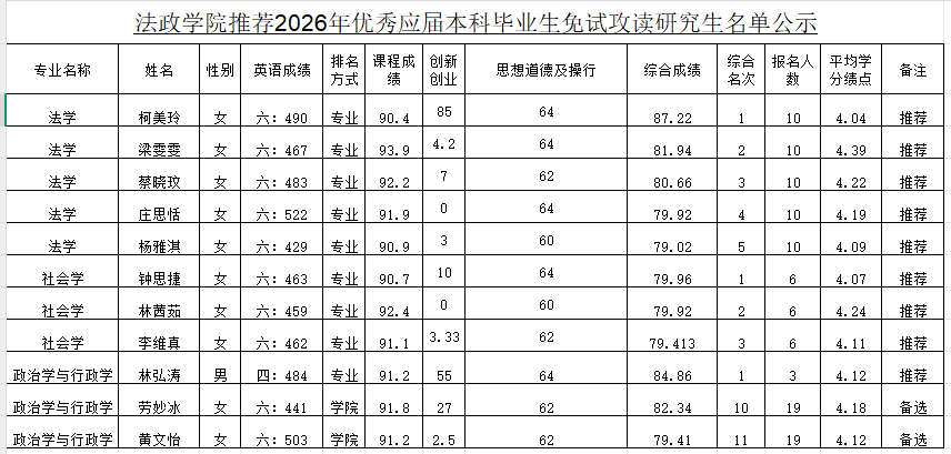 推荐柯美玲等9名学生免试攻读研究生。现对答辩结果和推荐情况予以公示。